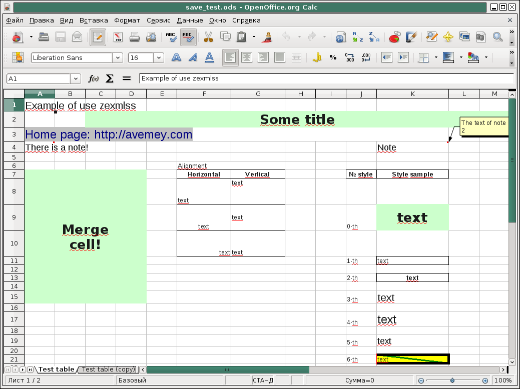 Cell style, merge cells, alignment, notes, links. Saving in formats: excel XML Spreadsheet and OpenDocument Format (ODS).