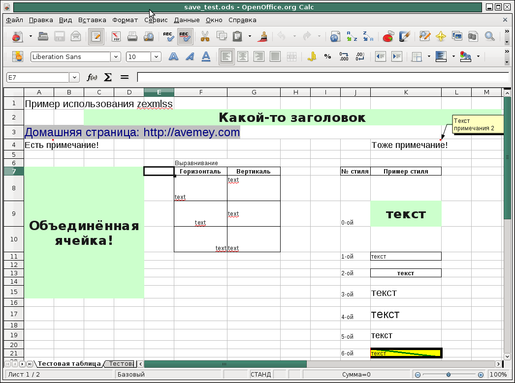 Документ, созданный с помощью zexmlss открытый в OpenOffice Calc.